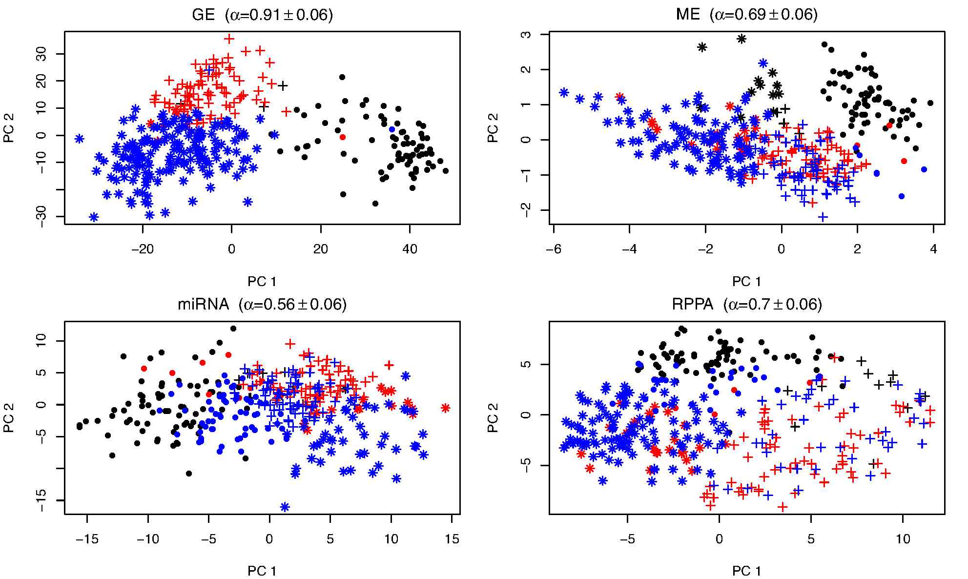 JIVE is a flexible exploratory method for the integrated dimension reduction and visualization of multiple datatypes on the same set of samples. Original Matlab scripts and sample data are available here, and a user-friendly R package with some enhancements is available here. The original manuscript is published in the Annals of Applied Statistics (link), and a the R package is described in Bioinformatics (link) with enhancements to predict an outcome described here (2017) and here (2022). The original development was joint work with Katherine Hoadley, Steve Marron, and Andrew Nobel; the R package was developed with Michael O'Connell, Adam Kaplan, and Elise Palzer.